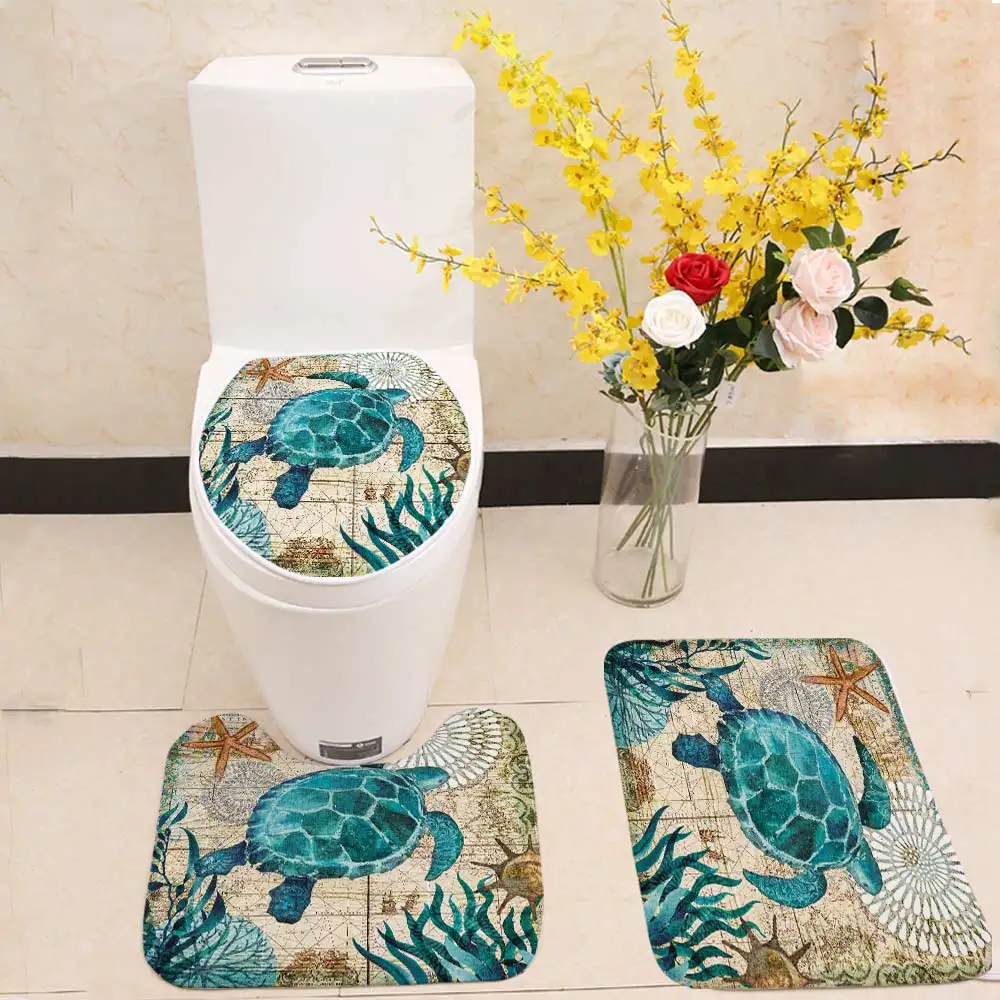 Miracille Marine Style 3 Pieces Set Toilet Seat Cover WC Set Sea Turtle Printed Bathroom Mat Washab