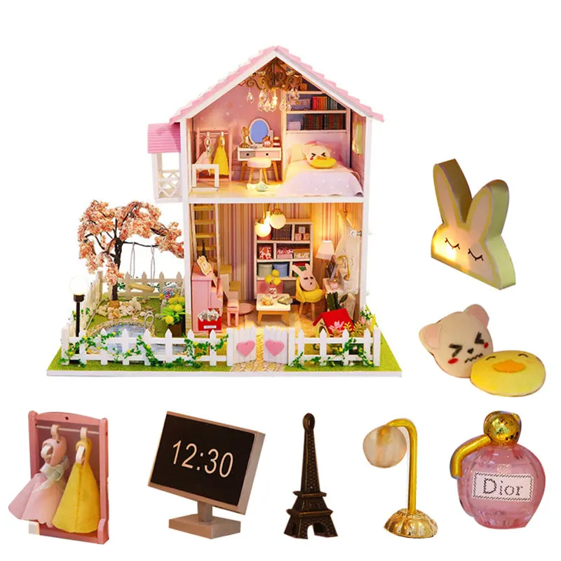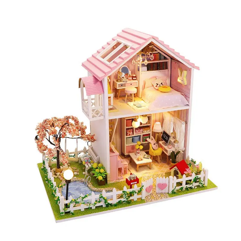 Review pink doll house garden wooden villa miniature dollhouse kit accessories furniture wood house toy fo